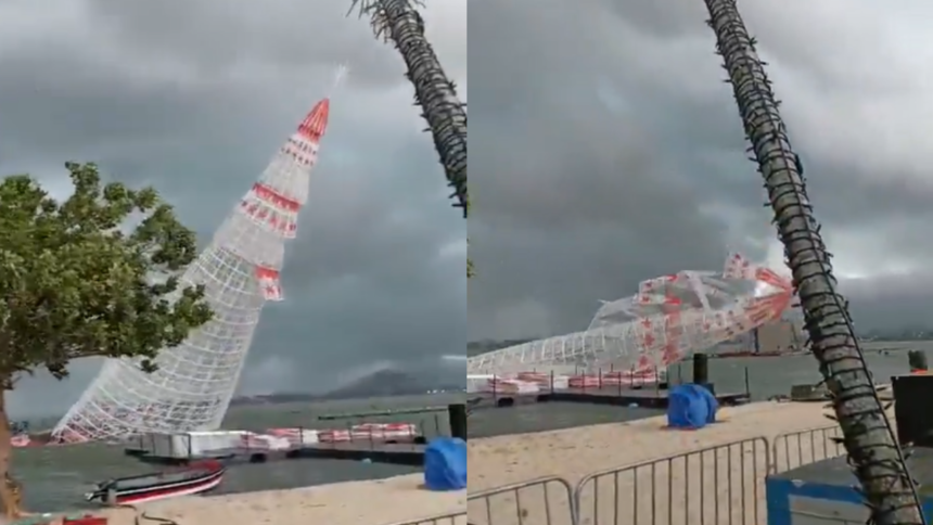 O município informou que, assim que a Defesa Civil emitiu um alerta de chuva forte, às 15h45, a empresa contratada para a montagem da árvore iniciou a retirada dos funcionários. Nesse momento, os trabalhadores foram surpreendidos pela passagem de uma tempestade, com fortes ventos e muita chuva, que derrubou a estrutura em poucos segundos.