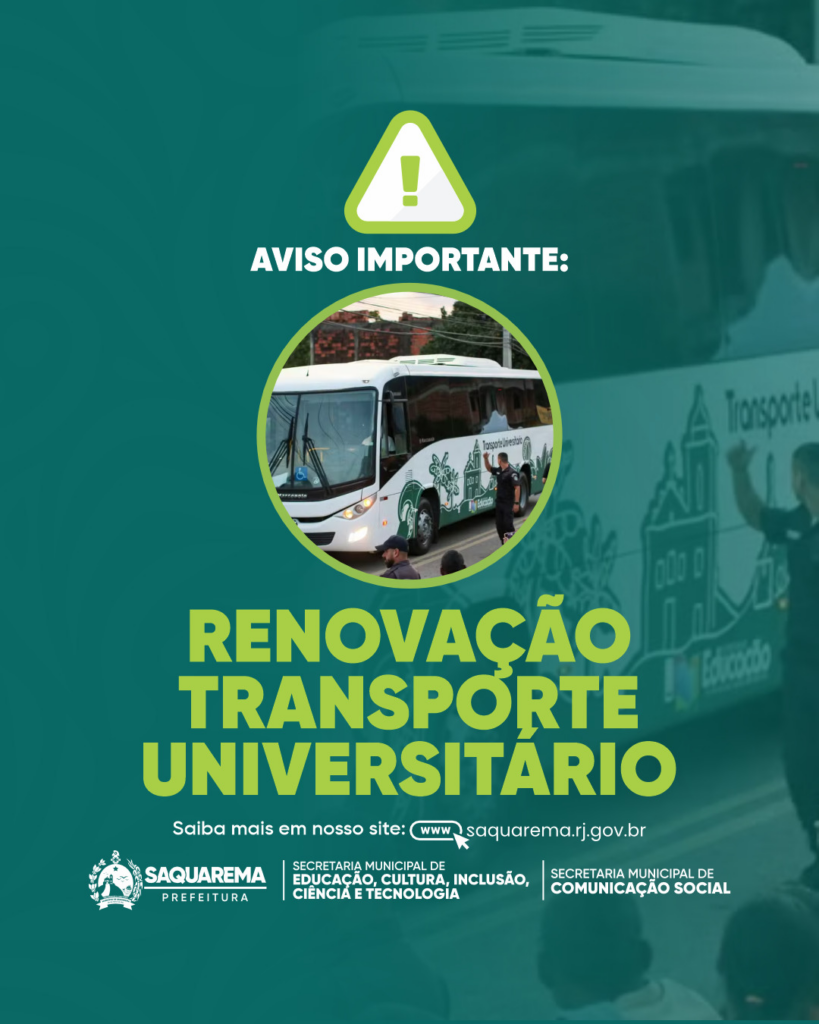 Alunos que já usam o transporte universitário em Saquarema devem renovar o acesso ao serviço. O prazo começa no próximo dia 30 de janeiro a 21 de março, dependendo da instituição em que o aluno estuda. Reforçando: a renovação é exclusiva para quem utilizou o transporte no ano passado. Confira os documentos.