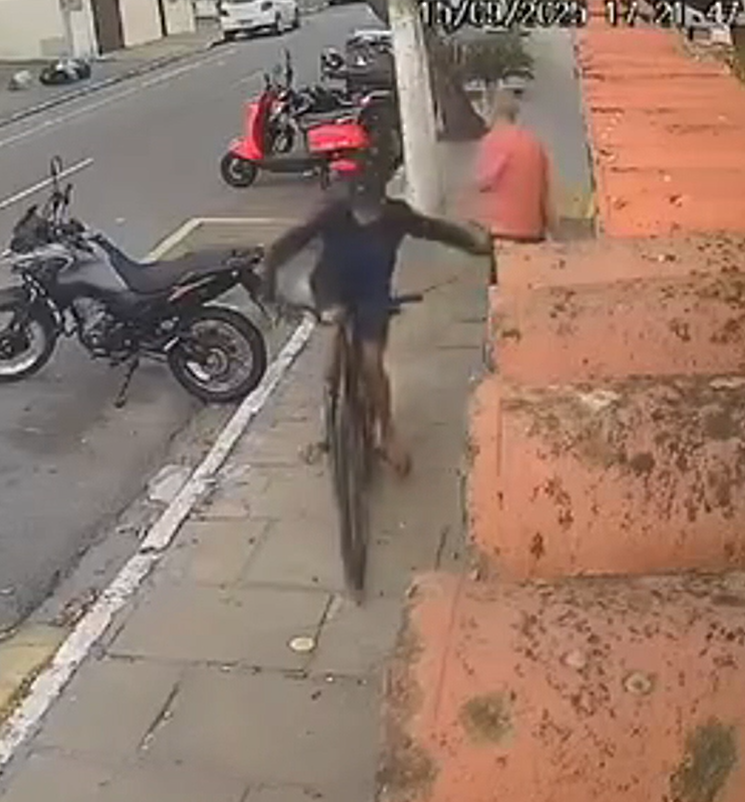 As imagens mostram o momento em que um indivíduo em uma bicicleta se aproximou e puxou o cordão da vítima, fugindo em seguida. A vítima ainda tentou correr, mas acabou se desequilibrando.