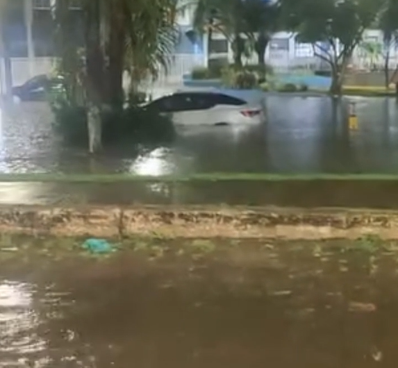 Imagens que circularam nas redes sociais mostram ruas completamente alagadas, inclusive em frente à Prefeitura, no Centro da cidade, onde veículos chegaram a ficar parcialmente submersos. Em outro registro, um ciclista tenta atravessar uma via tomada pela água, acaba caindo e protesta contra a situação.