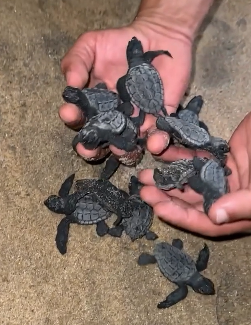 Ação Solidária Ao perceberem a situação delicada, moradores que estavam no local agiram rapidamente. Com cuidado e responsabilidade, eles recolheram os filhotes desorientados e os conduziram com segurança até a linha da água, garantindo que chegassem ao mar.