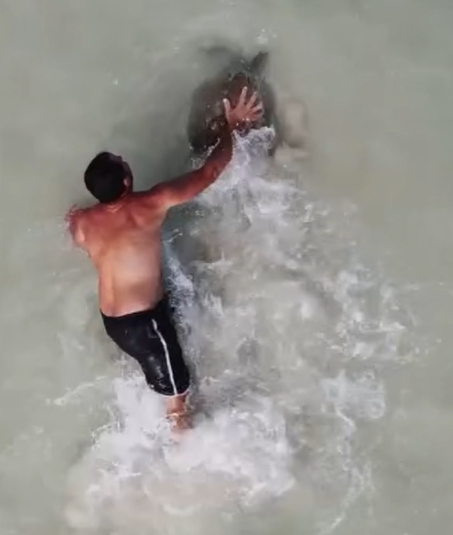 Imagens registradas na Praia Grande mostram homem segurando animal após captura em rede de pesca; caso repercute nas redes sociais