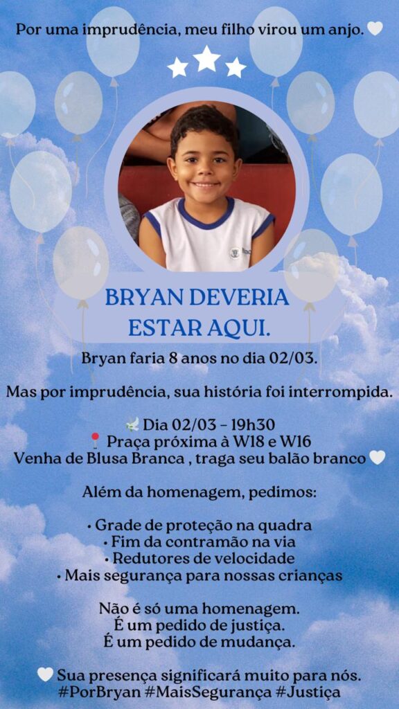 Em relato emocionado, a mãe, Veruska França, descreveu o momento do acidente. Segundo ela, Bryan havia ido buscar uma bola quando foi surpreendido pela moto.