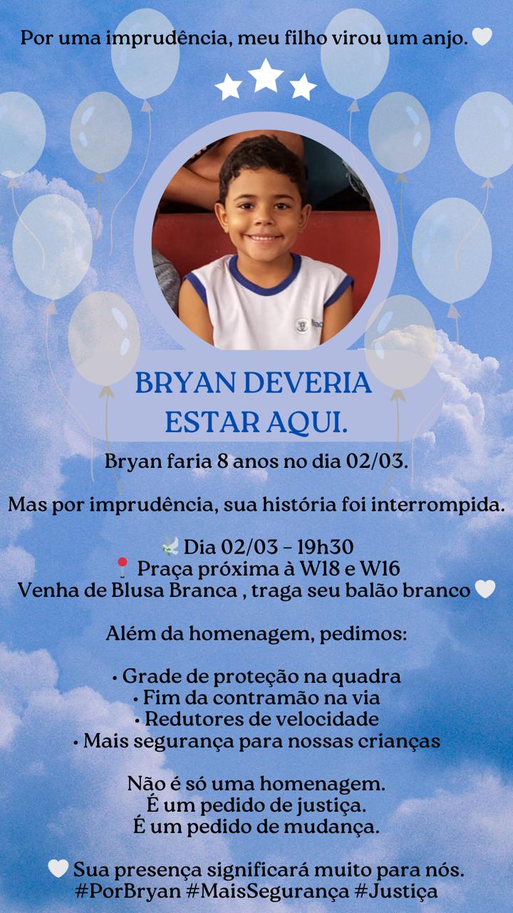 Bryan morreu na noite de 24 de outubro de 2025, após ser atingido por uma motocicleta ao tentar atravessar a via. Segundo a Polícia Militar, uma ambulância foi acionada, mas o menino não resistiu aos ferimentos e morreu ainda no local.