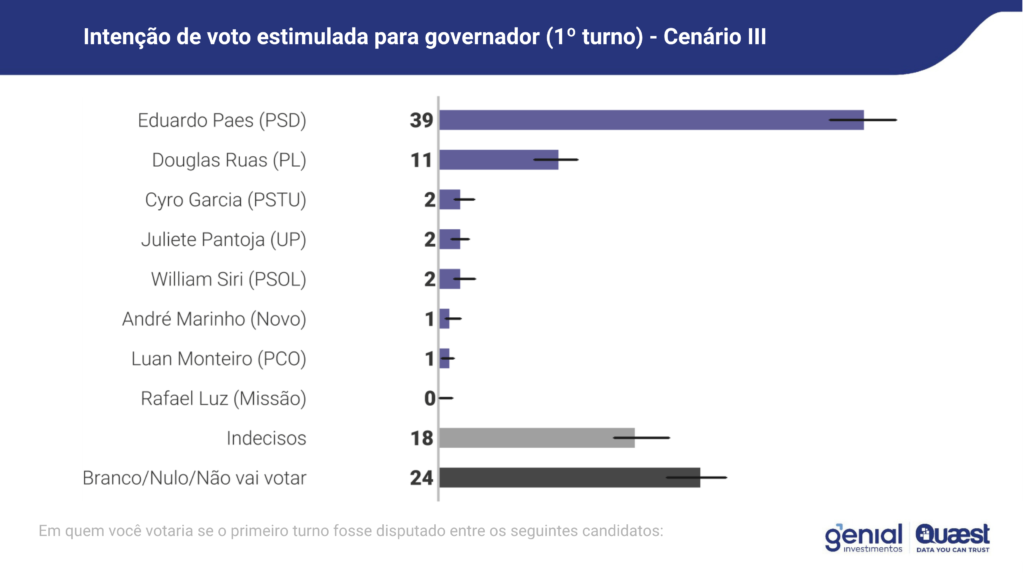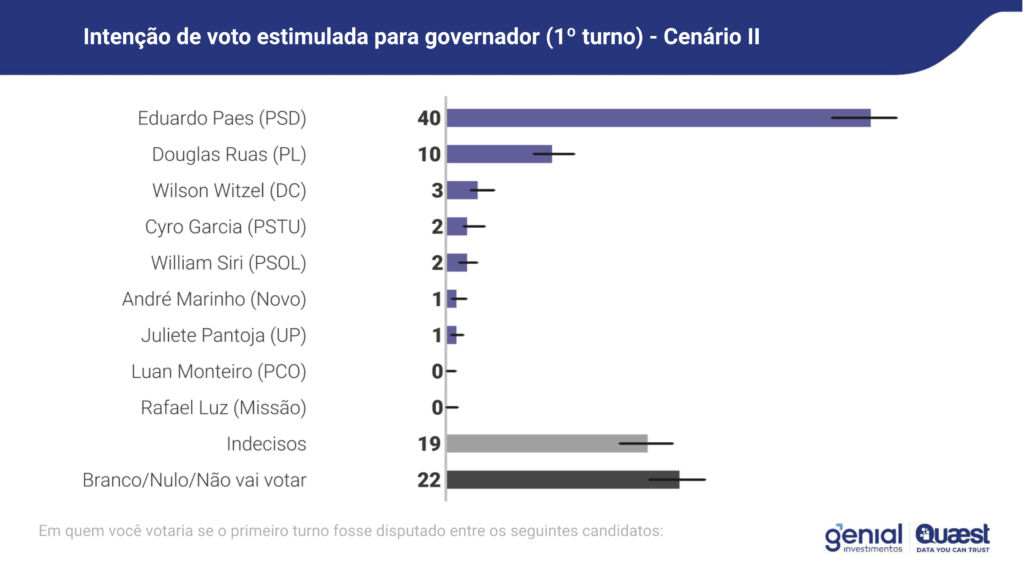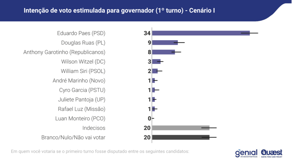 No primeiro cenário, Eduardo Paes (PSD) tem 34% das intenções de voto; Douglas Ruas (PL),9%; Anthony Garotinho (Republicanos), 8%; Wilson Witzel (DC), 3%; Willian Siri (PSOL), 2%; Ciro Garcia (PSTU), 1%; Juliete Pantoja (UP), 1%; Rafael Luz (Missão), 1%. Luan Monteiro (PCO) não pontuou. A soma de indecisos, brancos, nulos e que não vão votar chega a 40%.