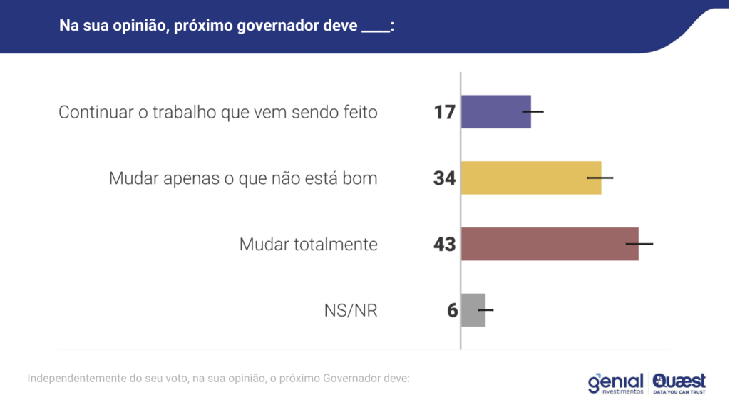 Na pesquisa da Quaest os eleitores também foram questionados sobre o ex-governador Cláudio Castro (PL). O índice de desaprovação chega a 47%. Outros 35% aprovam. De todos os 1.200 entrevistados, 43% afirmam que o próximo governador deve mudar totalmente a maneira de administrar o estado do RJ.