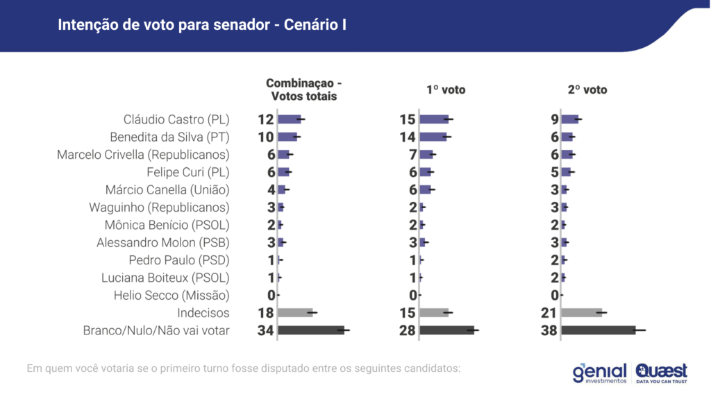 Ainda segundo a pesquisa, mais da metade dos eleitores fluminenses não definiram voto para senador: 18% estão indecisos e 34% apontam como branco, nulo e não votarão. Na pesquisa, o ex-governador Claudio Castro (PL) tem 12%; Benedita da Silva (PT), 10%; Marcelo Crivella (Republicanos), 6%; Felipe Cury (PL), 6%; Márcio Canela (União), 4%; Waguinho (Republicanos), 3%; Monica Benício (PSOL), 2%; Alessandro Molon (PSB), 3%; Pedro Paulo (PSD), 1%; Luciana Boiteux (PSOL), 1%; Helio Secco (MISSÃO) não pontuou.