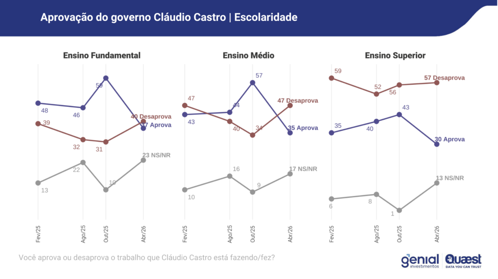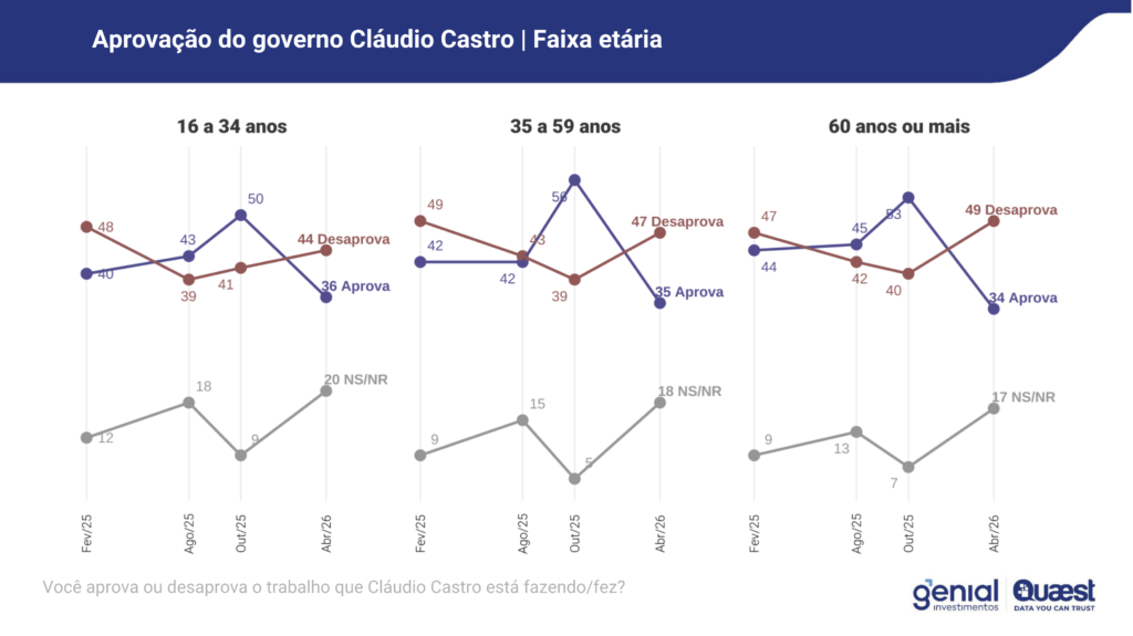 A pesquisa mostra que o percentual de reprovação de Cláudio Castro (PL) é alto em todas as faixas etárias, e chega a 49% entre os idosos. Em todos os níveis de escolaridade, a taxa de reprovação do ex-governador passa dos 40%. Para os eleitores com nível superior o índice de rejeição é de 57%.