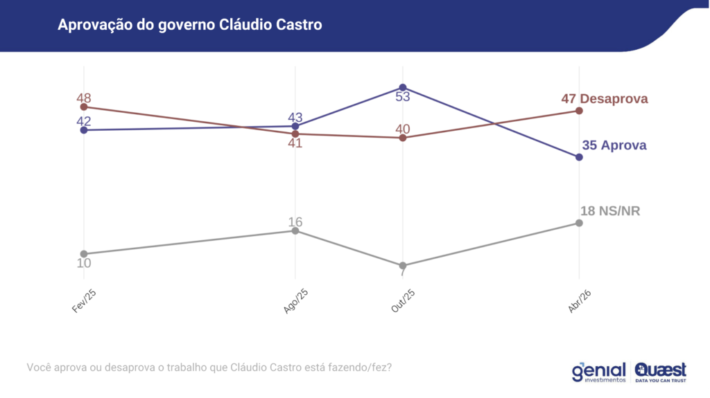 Cláudio Castro foi considerado inelegível pelo Tribunal Superior Eleitoral (TSE) por abuso de poder nas eleições de 2022 um mês após renunciar ao cargo de governador. Na pesquisa realizada na semana passada pela Quaest, 47% dos entrevistados reprovam a gestão do ex-governador. Percentual que subiu sete pontos desde o último levantamento, em outubro do ano passado. A taxa de aprovação despencou de 53% em outubro para 35% agora.