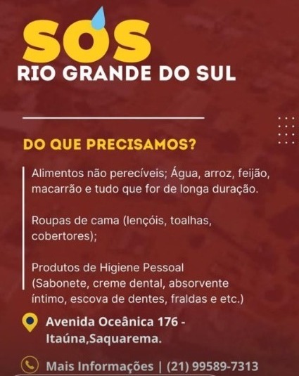 Lucas Chumbo também está liderando uma campanha para arrecadação de mantimentos em Saquarema. Segundo o surfista, as doações devem ser encaminhadas na terça (7) para o Rio Grande do Sul. Estão sendo recebidos alimentos não perecíveis, roupas de cama e itens de higiene pessoal.