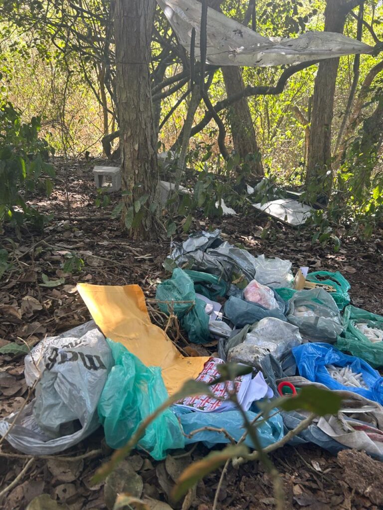 Os policiais fizeram uma busca na região da comunidade do Pântano e encontraram um tonel enterrado. Dentro dele, foram flagrados 600 pinos de cocaína e três quilos de maconha, além de 800 pinos vazios e material usado para preparação das drogas.