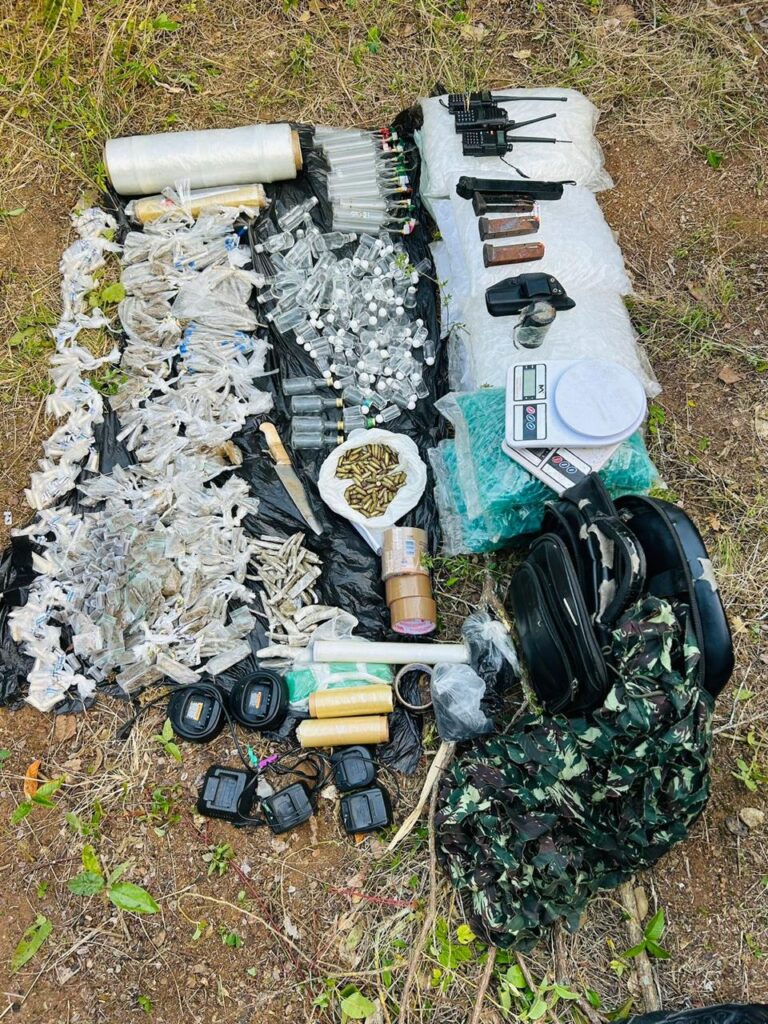No local, os policiais encontraram, além da granada e dos carregadores, 116 munições, 734 buchas de maconha, 110 pinos de cocaína, 117 frascos de lança-perfume, três rádios transmissores e duas balanças. Também foi achado um coldre, equipamento usado para guardar arma junto ao corpo.