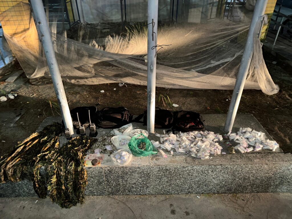 Dentro delas, foram encontradas, no total, 300 tiras de maconha, 212 cápsulas de cocaína e 178 pedras de crack, além de três rádios transmissores, um carregador de rádio e uma roupa camuflada. Todo o material e o adolescente foram levados para a delegacia de Cabo Frio, onde o caso foi registrado.