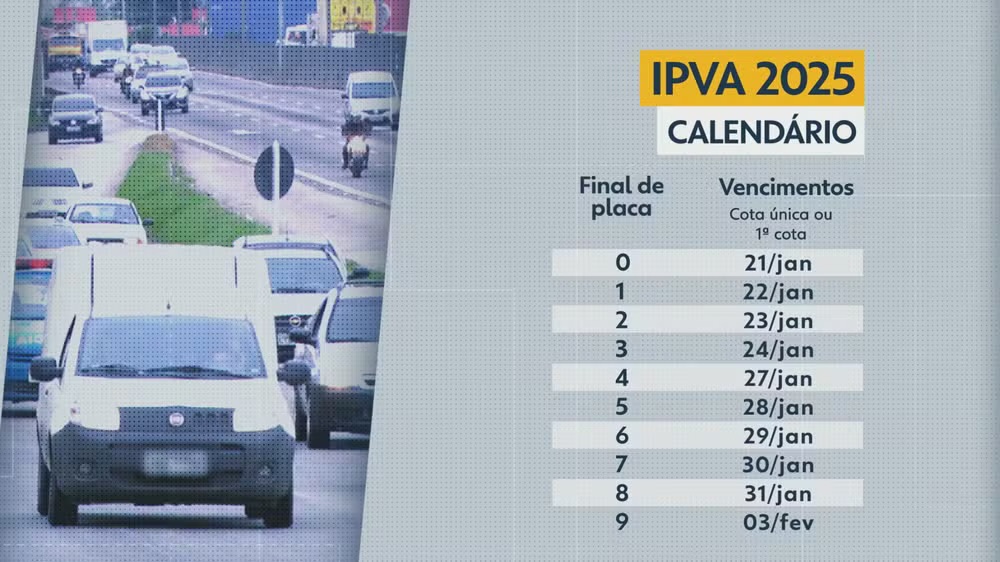 O vencimento da cota única ou da 1ª parcela começa no dia 21 de janeiro de 2025, para veículos com placa final 0. O prazo varia conforme o número final das placas dos veículos.