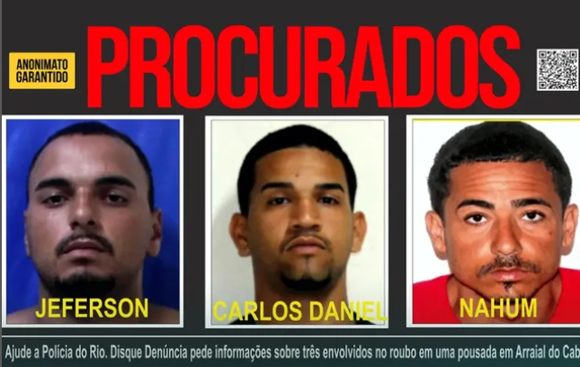 O Disque Denúncia divulgou nesta quinta-feira (26) um cartaz com os rostos dos suspeitos de assaltar um empresário francês, dono de uma pousada em Arraial do Cabo no dia 11 de junho. Segundo a polícia, os três suspeitos agrediram e amarraram a vítima e fugiram levando cartão bancário, um aparelho de TV, uma caixa de som e um celular.