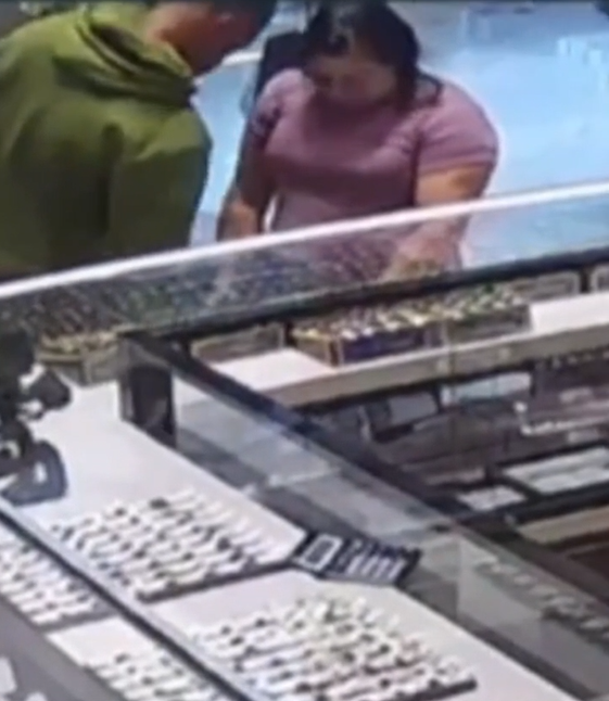 Imagens mostram um homem colocando uma bandeja de cordões de ouro na bolsa de uma mulher, enquanto outro distraía a vendedora.