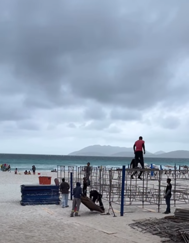 A montagem do palco para o Réveillon 2026 já começou na Praia do Forte, na altura dos quiosques, em Cabo Frio. A estrutura vai receber o show do grupo Sorriso Maroto, confirmado para a noite da virada do ano.
