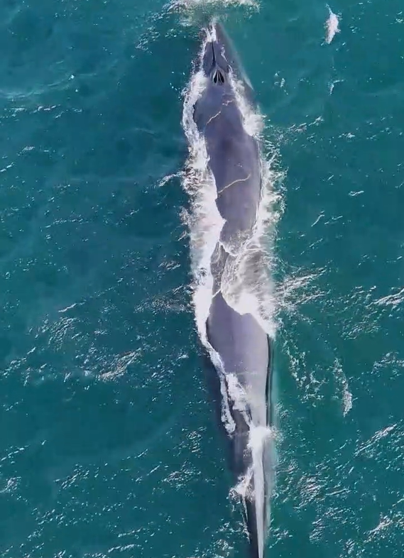 Espécie não costuma ser avistada nesta época do ano no litoral do município; registro foi feito por drone no fim da tarde de terça-feira (27)