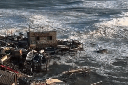 Ressaca destrói parte do deck dos pescadores na Praia Grande, em Arraial do Cabo