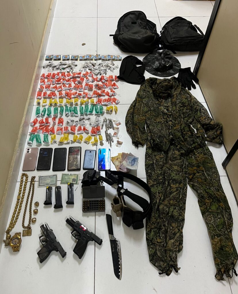 Com eles, a policia apreendeu 2 pistolas de uso restrito. Uma delas, com a numeração raspada. Alem de munição, drogas e materiais como roupas, relógios, jóias e celulares que podem ter sido roubados ou furtados.