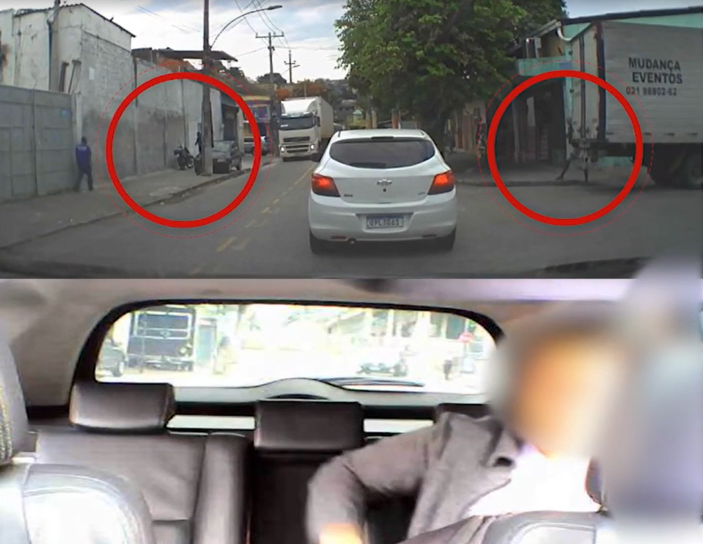 A passageira se desespera, pede ao motorista para abaixar os vidros e chega a desembarcar do carro. O condutor sai instantes depois. Logo aparecem outros 2 criminosos em uma moto.
