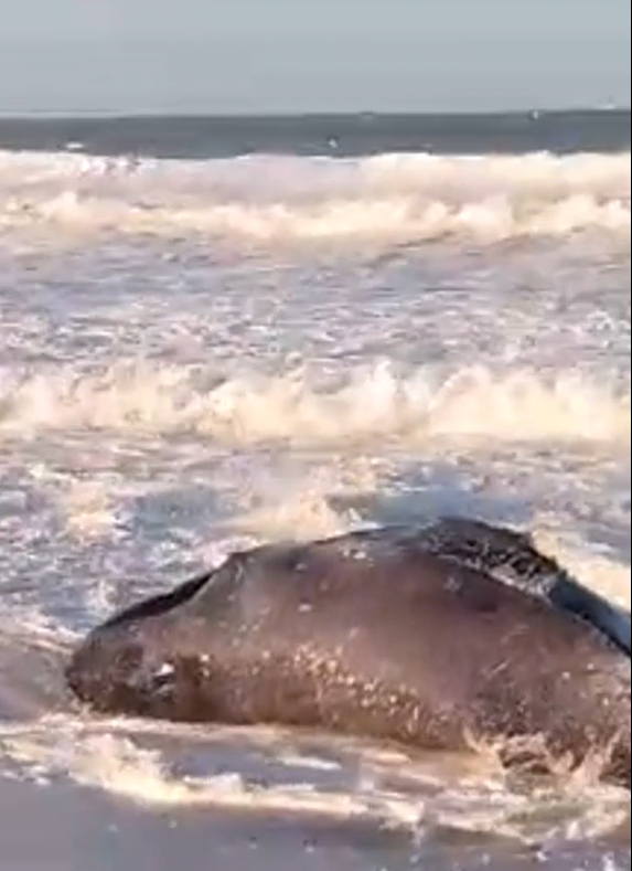 Alívio e emoção na Praia de Monte Alto nesta quarta-feira (30): o filhote de jubarte que apareceu encalhado conseguiu se desprender da areia por conta própria e tenta agora voltar ao alto-mar.