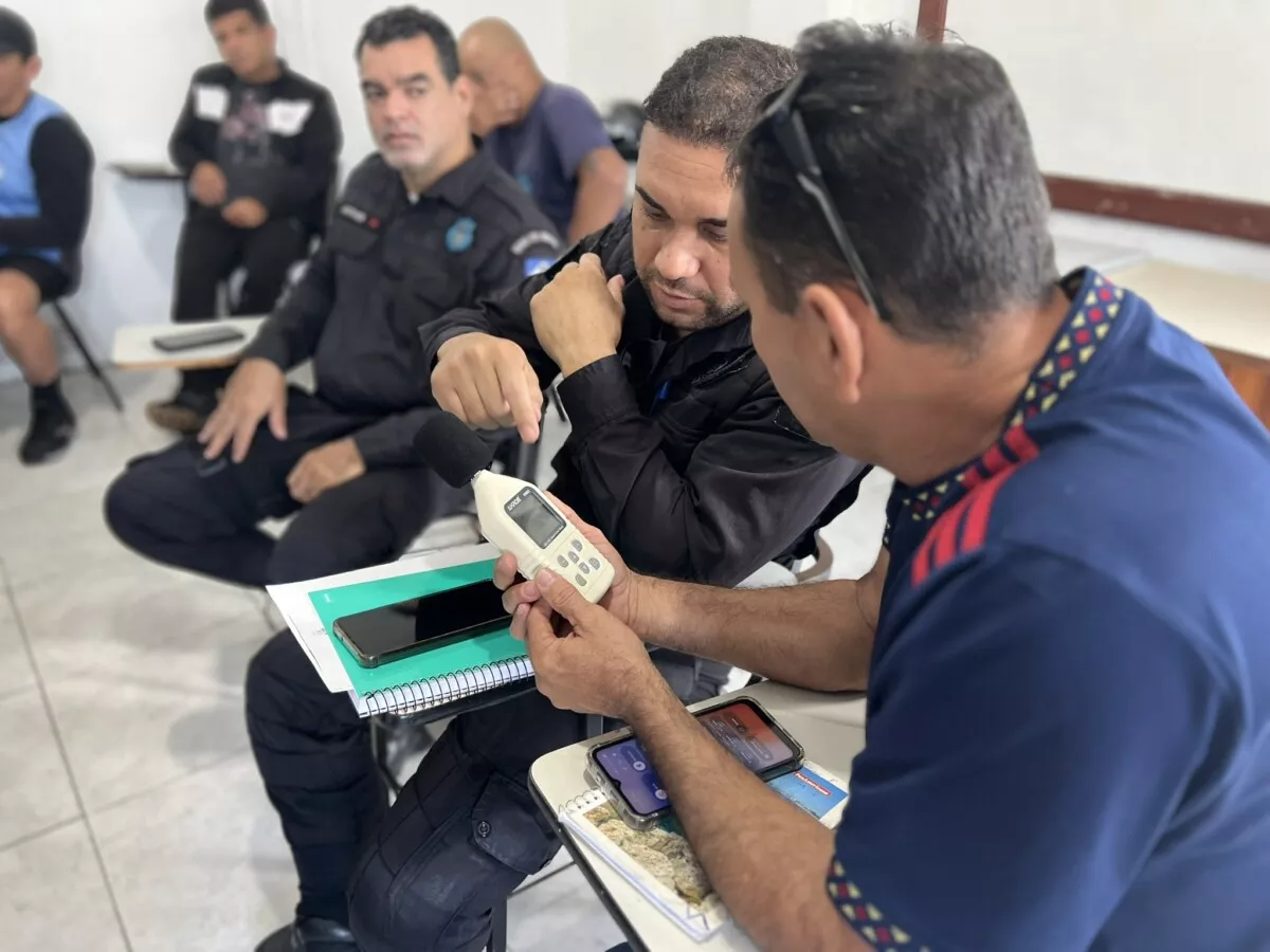 Além de aspectos técnicos, o curso abordou os limites de avaliação estabelecidos pela legislação, os procedimentos de medição em áreas externas e internas, e a elaboração de relatórios com parâmetros ambientais e registros fotográficos, fundamentais para subsidiar a fiscalização.