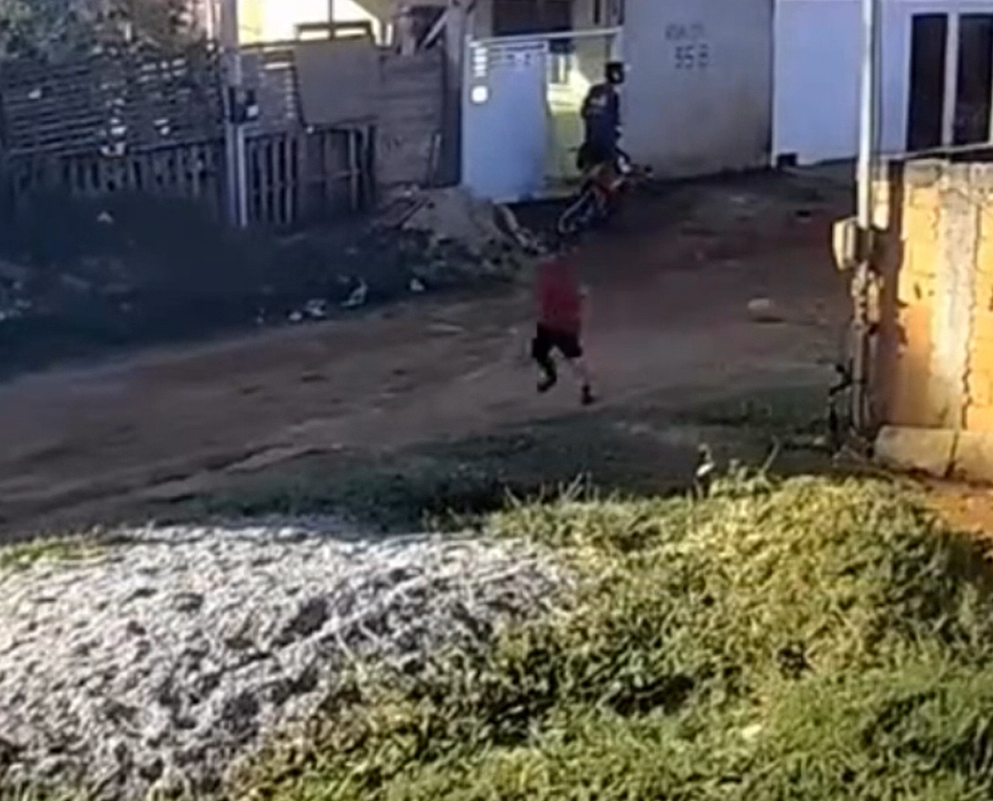 No vídeo, feito por câmera de segurança, é possível ver que os moradores ficaram assustados com os disparos e correm para se proteger.