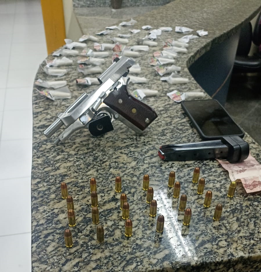 Com ele, foram encontrados uma pistola, dois carregadores e munições, além de cocaína, crack e um celular. Todo o material e o preso foram levados para a delegacia da cidade, onde o caso foi registrado. O homem vai responder por porte ilegal de arma de fogo e tráfico de drogas.