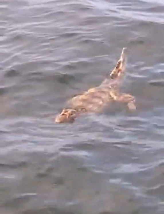 O animal, considerado grande, impressionou os pescadores e fugiu assim que os homens se aproximaram.