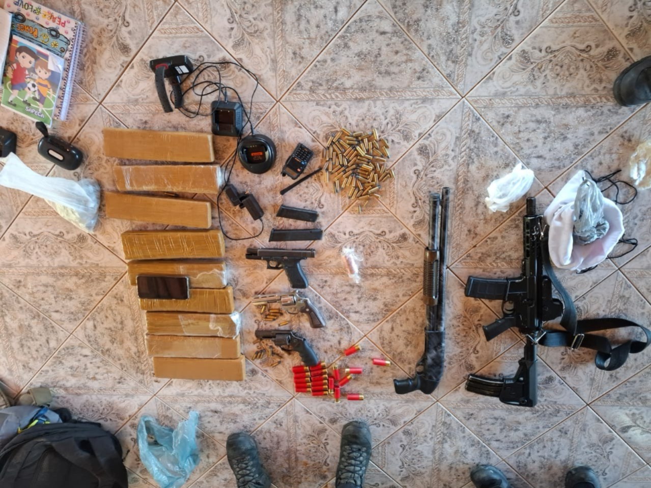 Além do fuzil, com numeração raspada, foram apreendidos uma espingarda, uma pistola, dois revólveres, munições, carregadores, 12 quilos de maconha, skank e cocaína.
