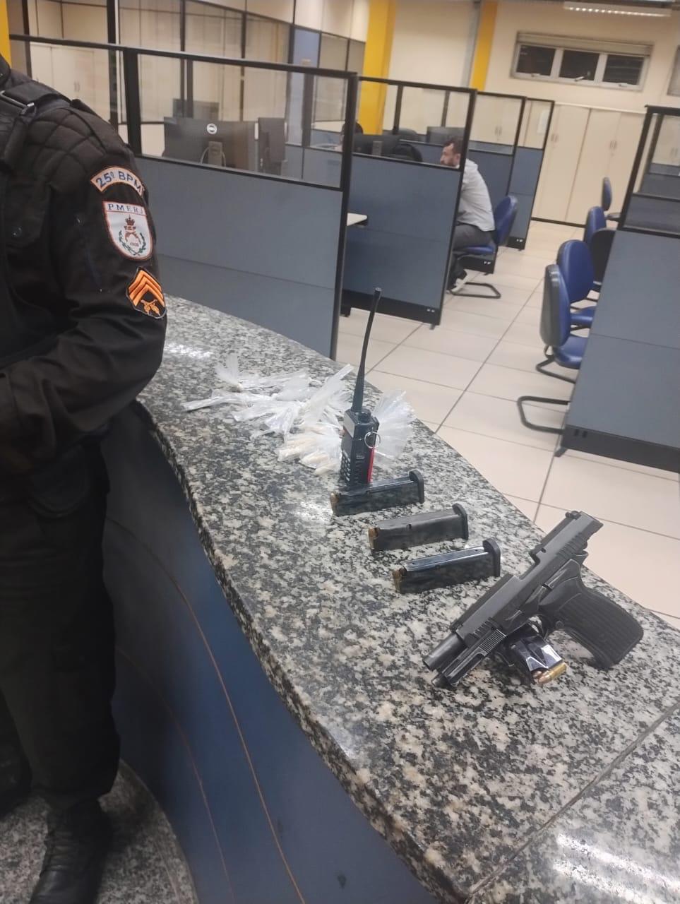 De acordo com a PM, a viatura se aproximou de um grupo de pessoas. Um homem teria apontado a arma para os policiais e fugiu. Ele foi perseguido e alcançado. Dentro de uma mochila que estava com o suspeito, a polícia encontrou uma pistola 9 milímetros, com numeração raspada. Também foram apreendidos munições, carregadores e drogas.