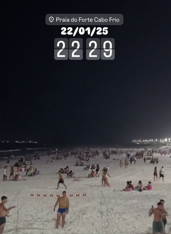 Imagens divulgadas nas redes sociais mostram que a Praia do Forte, em Cabo Frio, está ficando lotada, também à noite, por causa do calorão, como mostra o registro feito pela influencer Monique Bispo nessa quarta-feira (22).