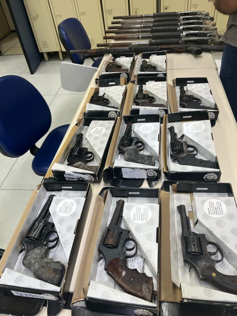 Foram encontrados 11 revólveres e 7 espingardas em situação de oxidação, além de 85 munições de espingardas e 110 munições de revolveres. O armamento estava exposto ao tempo e apresenta sinais de oxidação.