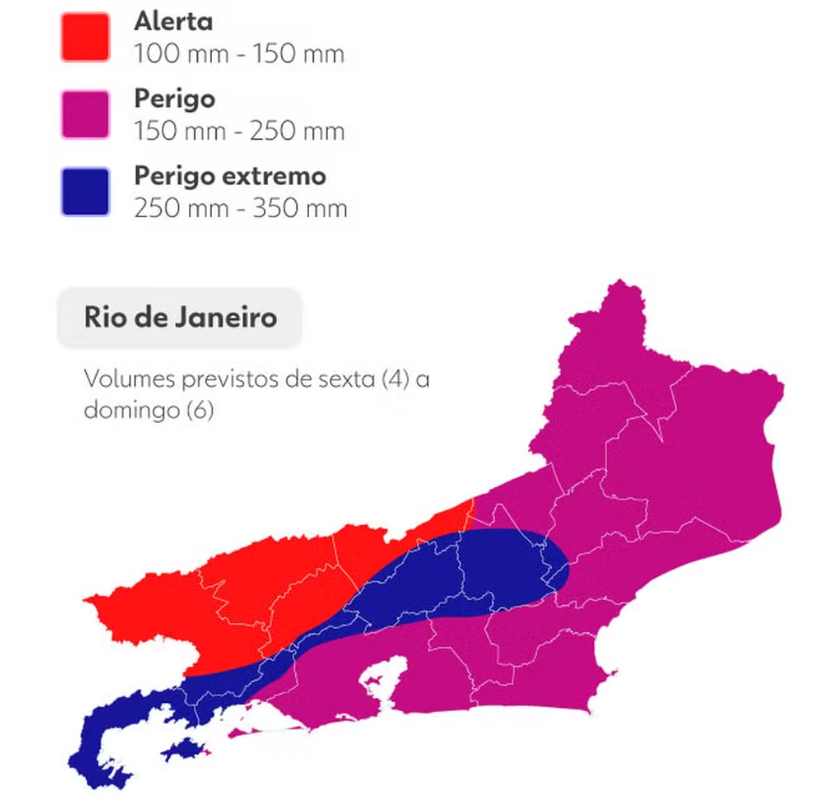 Na sexta, a Climatempo prevê “volumes excepcionais, com acumulados entre sexta e domingo que podem superar a média para todo o mês de abril”. Os volumes podem chegar a 350 milímetros em algumas regiões nos próximos dias.