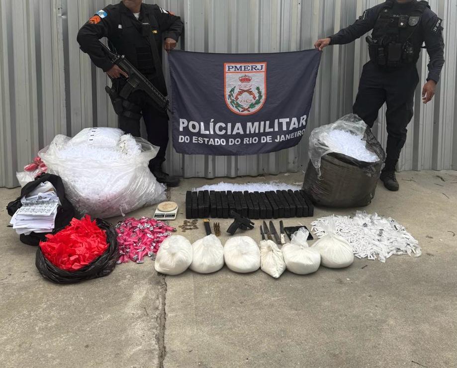 A polícia aprendeu uma grande quantidade de drogas nesta terça-feira (1) no bairro Baía Formosa em Búzios. Foram encontrados 20 quilos de cocaína, 20 quilos de maconha, além de mais mil e 600 pinos de cocaína. Também foram apreendidas uma pistola, munições e material para embalar a droga.