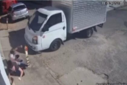 Caminhão desgovernado bate em portão de fábrica e por pouco não atinge duas mulheres
