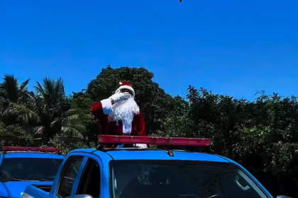 Papai Noel chega de viatura e PM distribui brinquedos na comunidade do Âncora, em Rio das Ostras