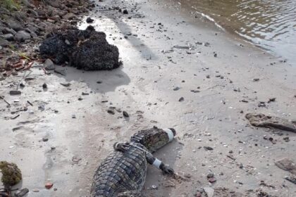Jacaré flagrado em praia de Cabo Frio é solto às margens do rio São João
